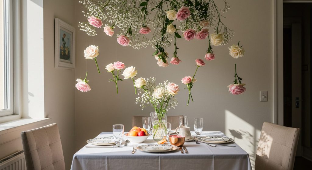 Suspend delicate arrangements of artificial flowers or dried blooms from your ceiling using transparent fishing line. These ethereal floating gardens create a whimsical, dreamy atmosphere while keeping surfaces clear for food and gifts.
