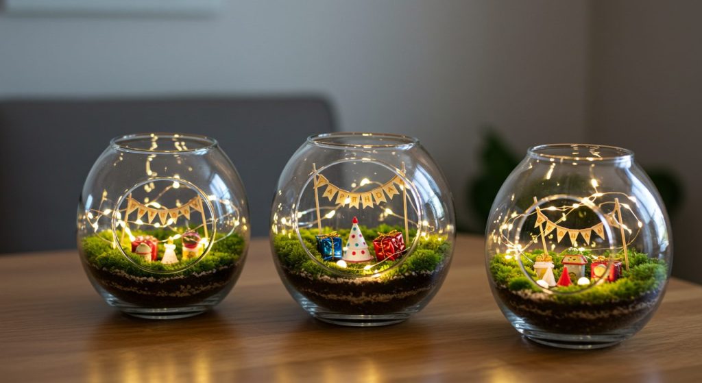 Create miniature celebratory worlds in glass terrariums or jars. Fill them with tiny decorations, fairy lights, and personalized elements for captivating, space-efficient centerpieces that don’t obstruct conversation across the table.
