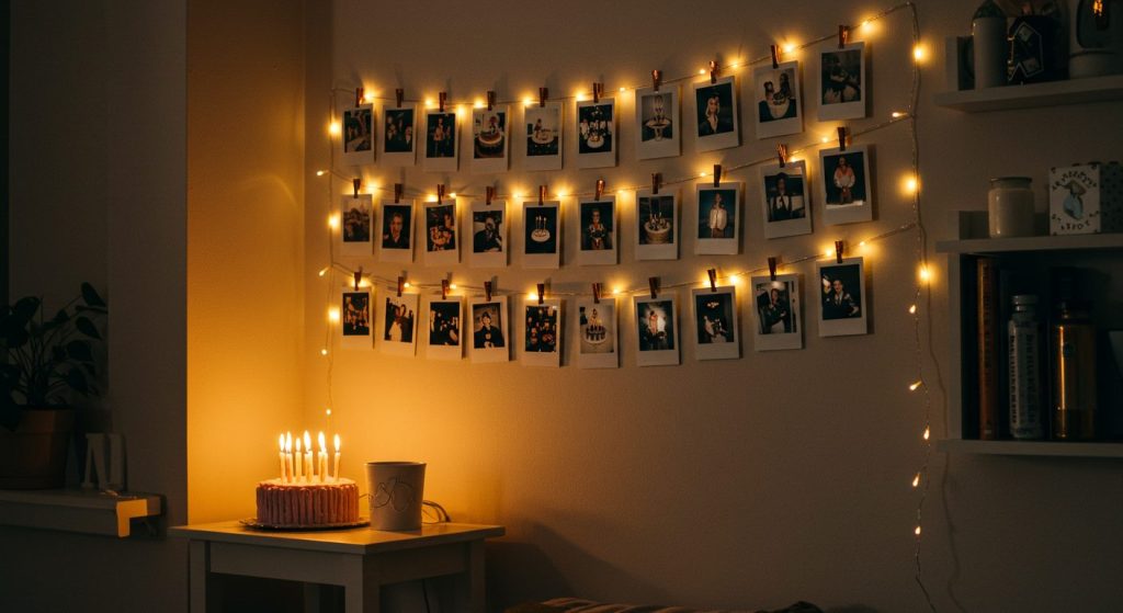 Transform your walls into personalized galleries by hanging string lights with mini clips to display photos of the birthday person. This decoration doubles as ambient lighting and a meaningful trip down memory lane.