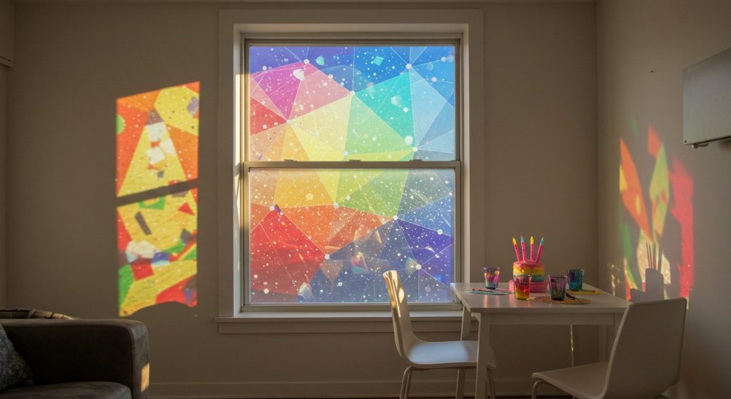 Apply temporary decorative window film to create stained-glass effects that transform natural light into colorful projections throughout your space. This zero-footprint decoration bathes your room in celebratory hues.