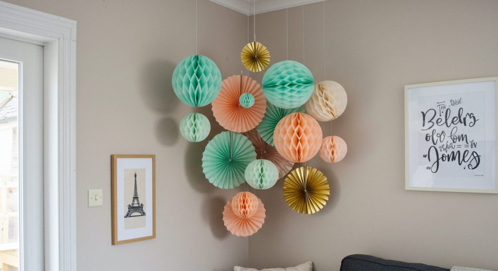 Group paper honeycomb balls and fans in complementary colors, hanging them at various heights in unused corner spaces. These lightweight decorations add dimension and festivity without requiring any surface area.