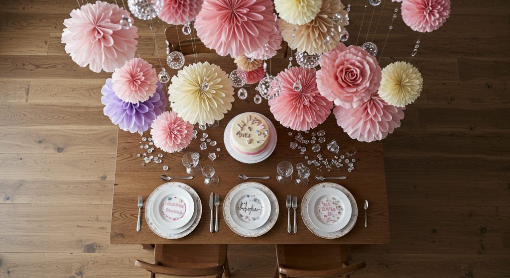 Replace traditional table centerpieces with delicate decorations suspended above your dining area. Hanging paper flowers, miniature disco balls, or themed ornaments keeps table surfaces clear for food and drinks.