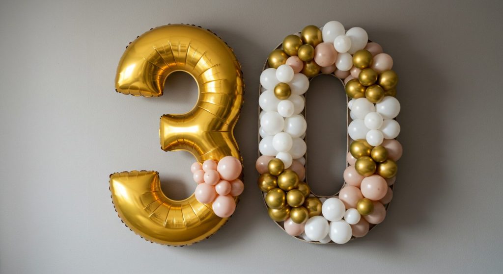 Create flat balloon “mosaics” on walls by arranging balloons of different sizes and colors in artistic patterns or numbers indicating the celebrant’s age. This 2D approach delivers high visual impact without protruding into your space.