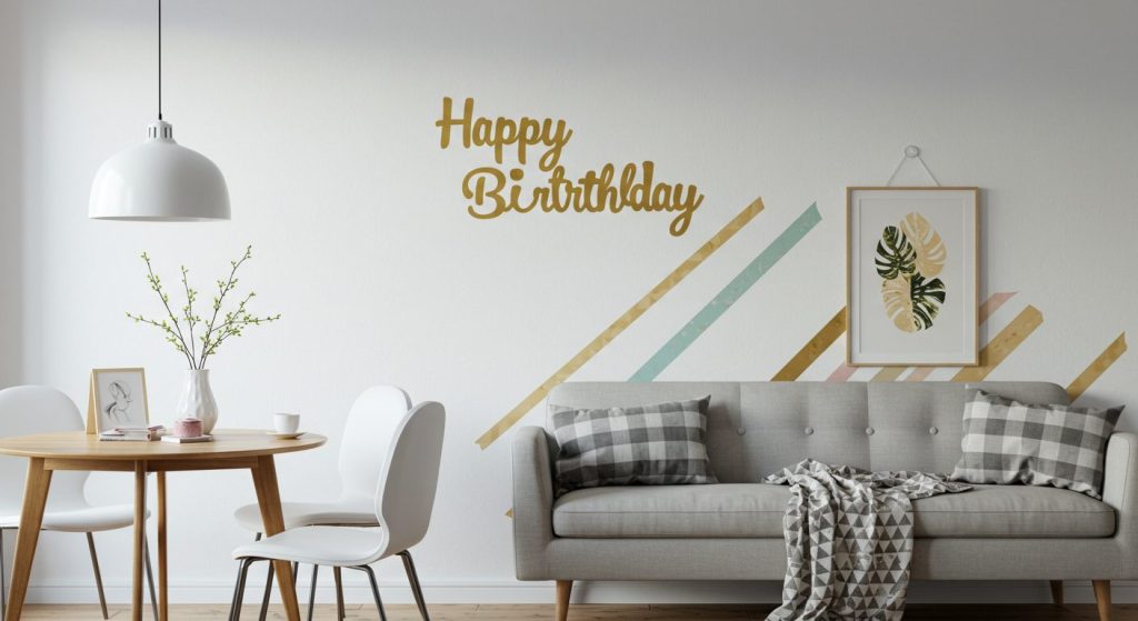 Use colorful washi tape to create geometric patterns, confetti designs, or even a “Happy Birthday” sign directly on your walls. This no-damage decoration method creates high visual impact with minimal materials and zero floor space.