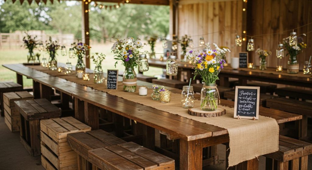 Combine comfort with style using natural wood elements, mason jars, and countryside-inspired decorations for a cozy celebration.